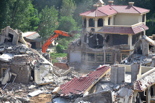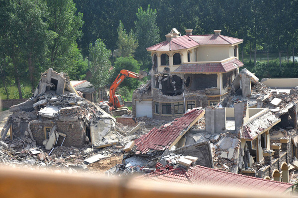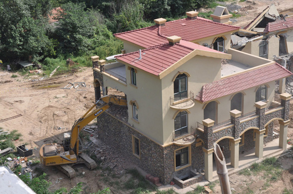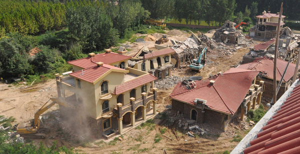 2013年8月18日,在黄河南岸郑州市惠济区花园口镇申庄村,违规修建的别墅正在被拆除。郑州市惠济区花园口镇申庄村违规修建并对外出售小产权别墅群被媒体曝光后,经国土部门测量认定,申庄村村支书占用15.8亩农业用地用于建设别墅。截至目前,已违规建成别墅6栋。郑州市惠济区政府回应称,已要求村支书申某三天内自行拆除这些违规别墅。