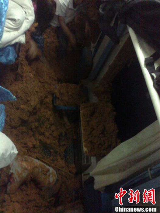 据目击者陈先生所说,泥土伴着沙石冲破车窗,将正坐在窗边座位上吃东西的2名成年男子掩埋。图为工作人员实施救援。