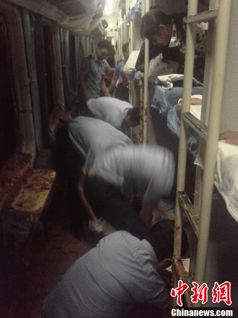 武汉铁路公安局乘警及时组织列车工作人员展开施救,徒手刨泥,及时将被埋旅客救出。