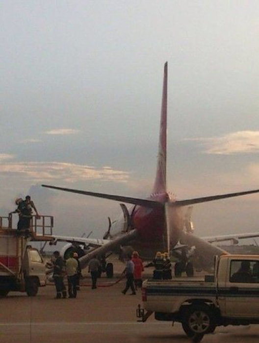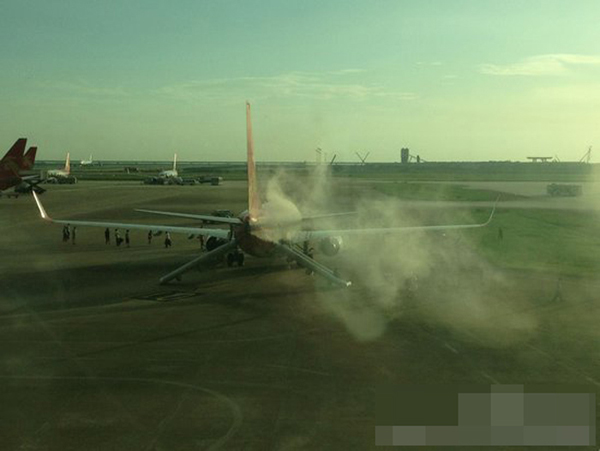 网友拍摄。2013年8月25日傍晚,深圳,深圳航空公司ZH9969(深圳-北京)航班,在深圳机场滑出时因APU(辅助动力系统)机械故障触发火警,导致飞机尾部有烟雾冒出。