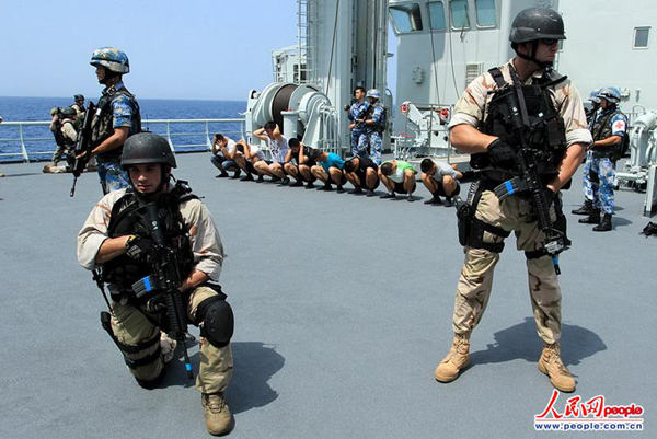 “Stop!Hand up!”舱面上的4名特战队员突然出击,将枪口对准“海盗”。