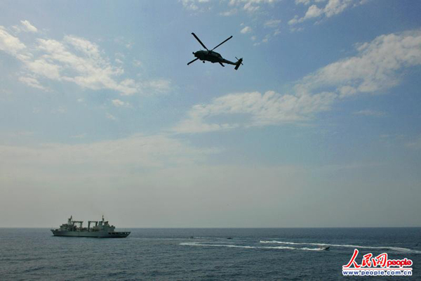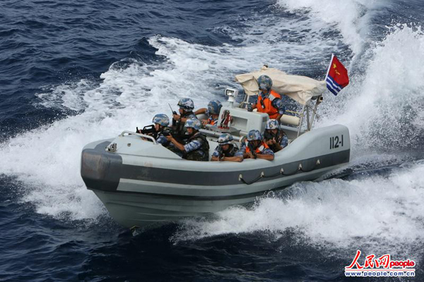 “可疑小艇向我船接近并对我实施了攻击,请求援助……”模拟“CCC”号商船的微山湖舰向中国海军哈尔滨舰发出求救信号。