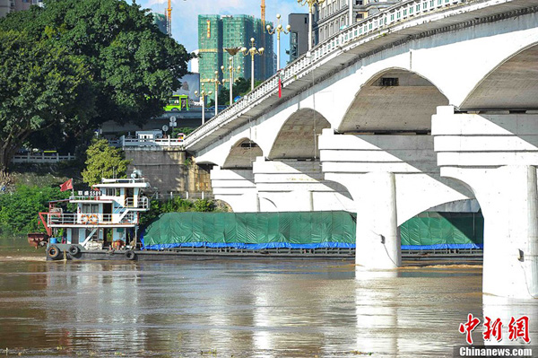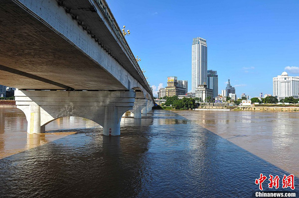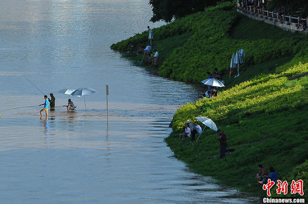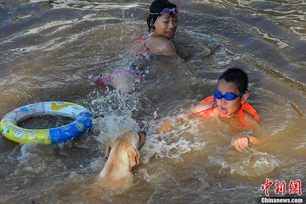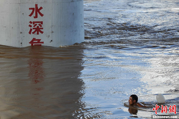广西南宁邕江水位暴涨 市民游泳消暑