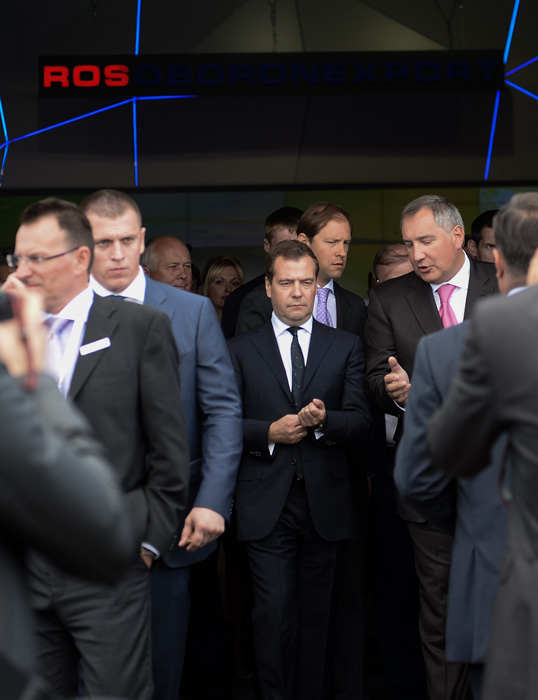 8月27日,俄罗斯总理梅德韦杰夫(中)参观莫斯科国际航空航天展览会。新华社记者贾宇辰摄