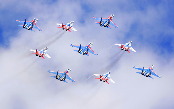 8月27日,俄罗斯著名的“俄罗斯勇士”和“雨燕”特技飞行队在莫斯科航展开幕式上进行混合编队表演。新华社发(申进科摄)