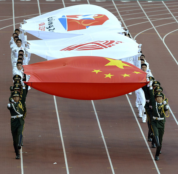 这是中华人民共和国国旗、中华人民共和国运动会会旗、第十二届全运会会旗入场。新华社记者王鹏摄