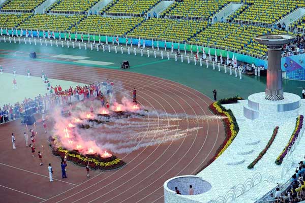 8月31日,第十二届全国运动会在辽宁省沈阳奥体中心体育场开幕。这是圣火在开幕式现场熊熊燃烧。新华社记者燕雁摄