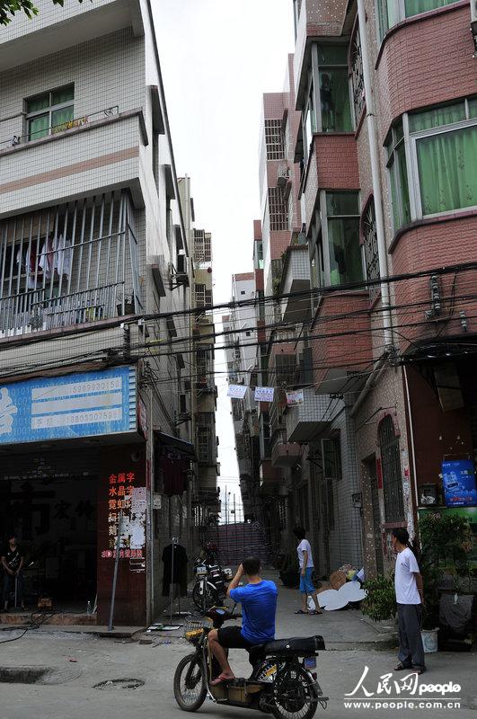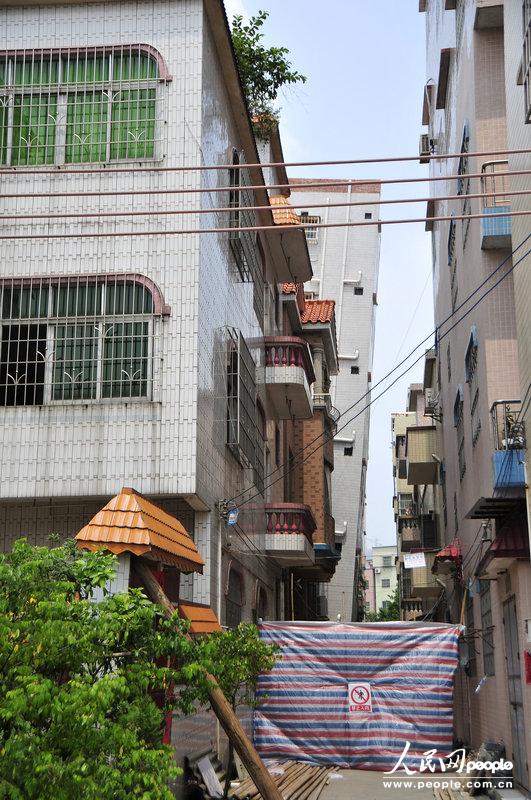 禁区中央是引发此次恐慌的斜降危房:16巷10号,高六层,面积约120多平方米。据记者在20米外所见,该楼房沉降近50厘米,向东倾斜近10度,距东侧的两栋较矮楼房仅约3米之遥。危房屋主梁志雄表示,全栋楼20多个房间,出租了其中的20个,即一栋楼里便住着21户人家,共数十人。据悉,该片房屋均为厦滘村民所有,15年前陆续建成,多为宅基地。