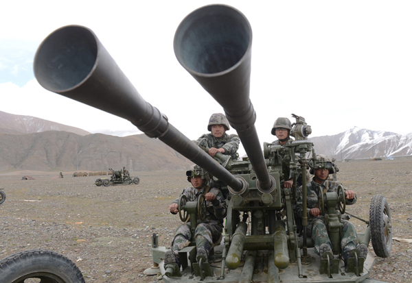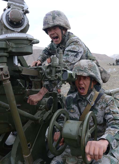 在演练中,兰州军区某防空旅官兵实施火力打击(9月9日摄)。新华社记者 张永进 摄