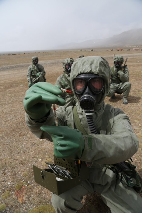 在演练中,兰州军区某防空旅官兵对染毒地域进行侦测(9月9日摄)。新华社记者 张永进 摄