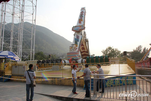 今天(9月15日)下午1时40分左右,西安秦岭欢乐世界极速风车设施发生事故,坐在上面的3位乘客先后被甩下受伤,1人被砸受轻伤,4人随后都被紧急送往兵器工业五二一医院。长安区栾镇街道办事处的主任薛亚洲表示是机械故障引发事故,而与伤者同坐一排的幸免者表示事故原因是工作人员并没有为他们系好安全扣。事发后,当地安监、公安、政府等相关部门对相关设施进行了查封。