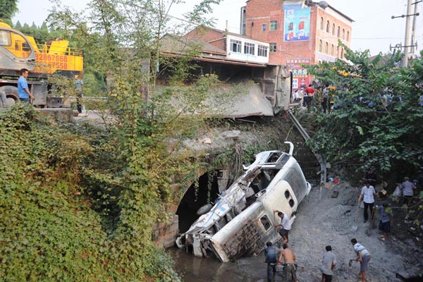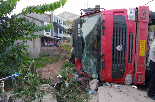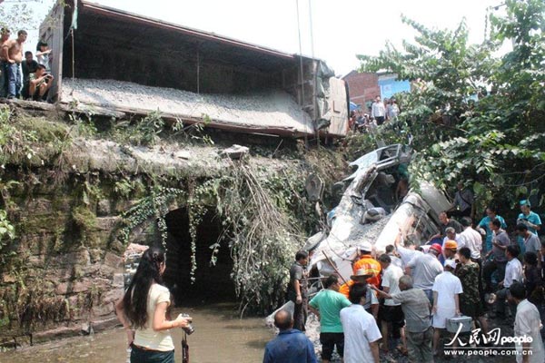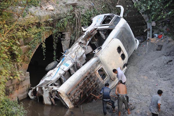 2013年09月15日,四川渠县一客车被撞翻桥下,救援现场。图片来源:CFP 版权作品、请勿转载