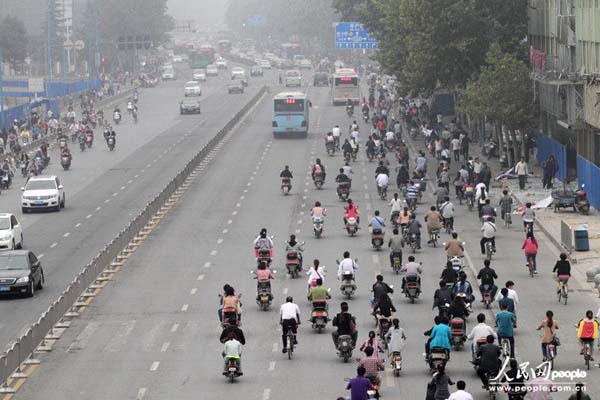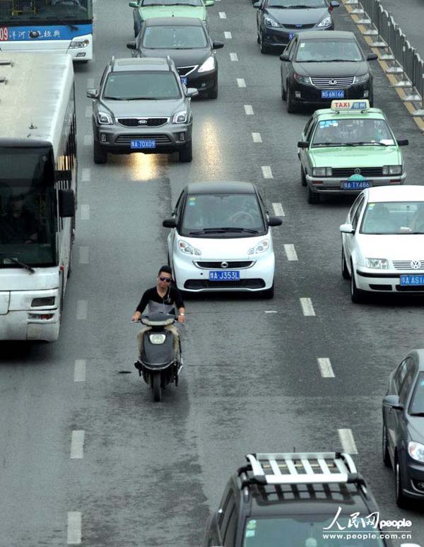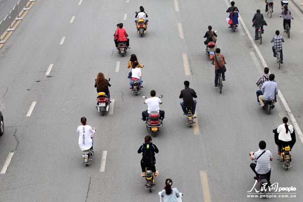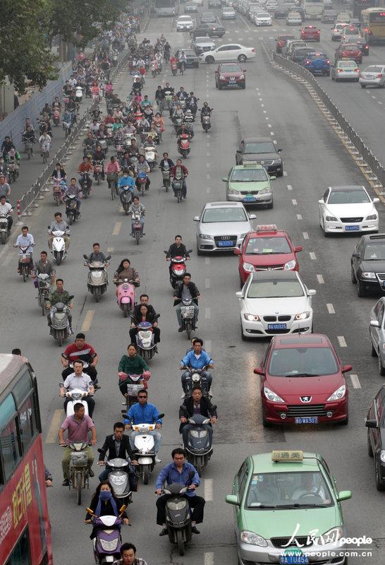 9月22日是世界无车日。上午8时许,郑州市花园路与农业路交叉口附近,大批非机动车违章走在机动车道上。一名群众说,这些电动车、自行车等非机动车,在车流量大的时候不知道等信号灯,他们一定要抢在一个信号灯内通过,就直接走在快车道上。