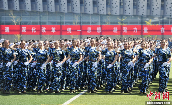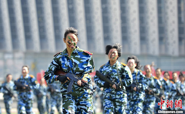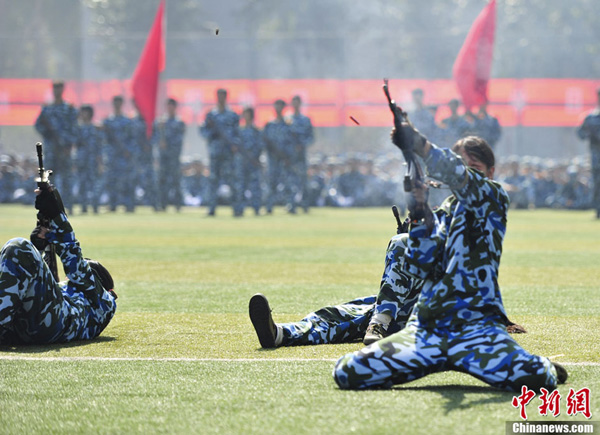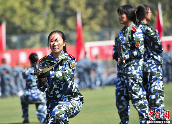 9月26日,山东大学2013级新生一身戎装,在济南的山东大学体育场演练军训科目。当日,在山东大学2013级学生军训阅兵典礼上,女大学生“真刀真枪”上阵演练擒拿格斗格外抢眼,几十天的军训生活,让这些“95后”女孩“脱胎换骨”,尽显阳刚之美。图为女大学生“实弹”对空射击。中新社发 张勇 摄