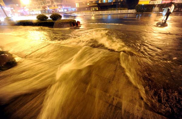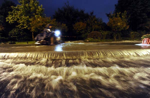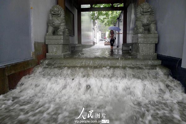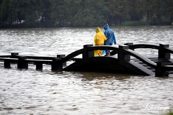 10月7日,受台风“菲特”影响,浙江省出现强降雨天气。杭州自7日凌晨开始持续降雨,杭州市气象台在7日13时20分发布暴雨蓝色预警信号,预计下午到夜里杭州市阴有中到大雨,北部山区局部暴雨。受强降雨影响,西湖出现罕见的水满现象。