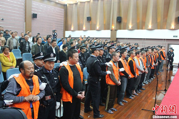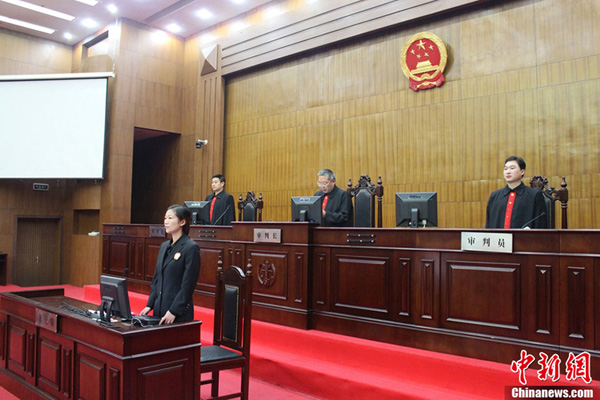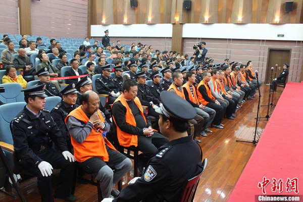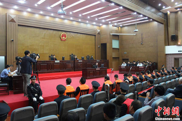 10月9日上午,涉案金额达6000万元,涉及117家大中型食用油、食品加工企业以及个人粮油店的特大地沟油案在江苏省连云港市中级人民法院一审判决。被告人王成奎犯生产、销售有毒、有害食品罪,判处无期徒刑,剥夺政治权利终身,并处没收个人全部财产。其余被告人各自获刑。该起案件是《中国食品安全法》颁布4年来,中国范围内涉及案值较大的一起地沟油案。图为法庭现场。盛茂 摄