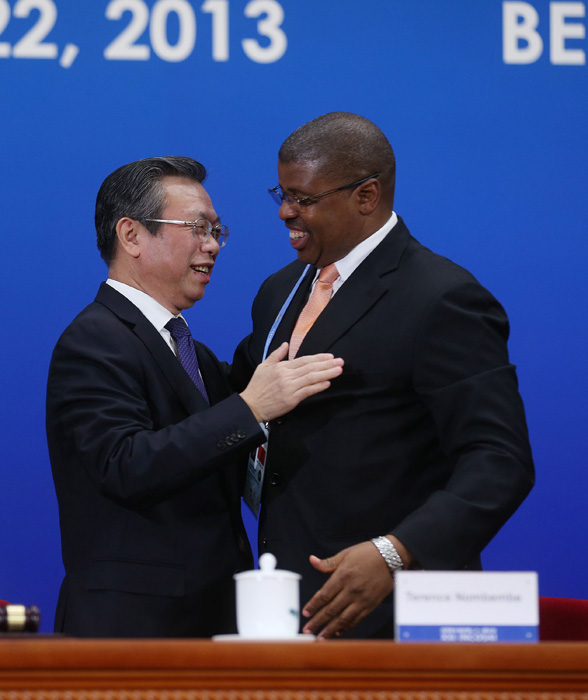 10月22日,刘家义接受卸任世界审计组织主席特伦斯·农贝贝的祝贺。新华社记者 王申 摄
