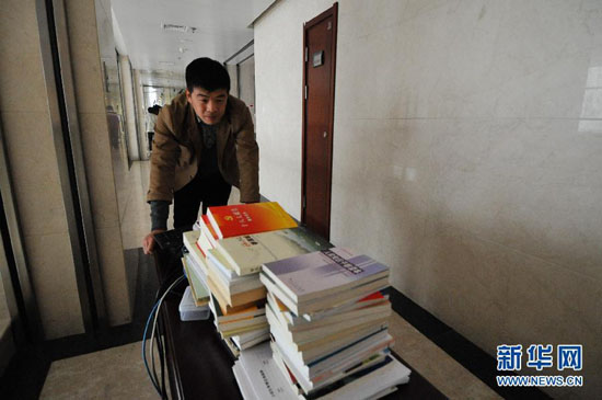 10月29日,在沛县行政中心主楼4楼,一名工作人员在搬运办公用品。