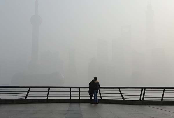 12月8日,一对情侣在浓雾笼罩下的上海外滩相拥。新华社发(赖鑫琳 摄)