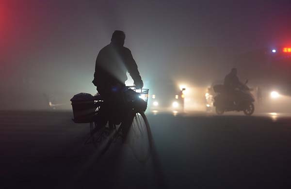 12月8日,在安徽省阜阳市街头,市民在雾霾中骑行。新华社发(卢启建 摄)