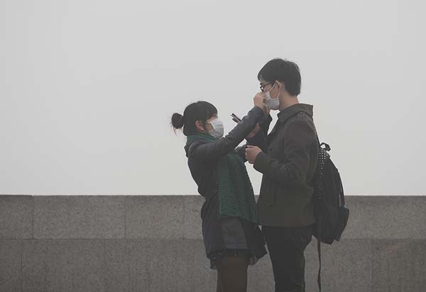 12月8日,在浓雾笼罩下的上海外滩,一位女士为男友整理口罩。新华社发(赖鑫琳 摄)