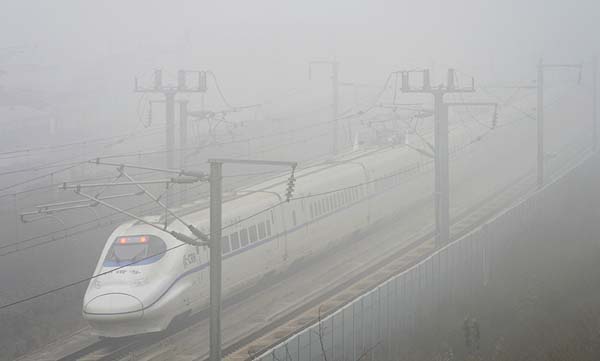 12月8日,沪宁城际铁路线上一列动车在浓雾中驶过江苏镇江段。新华社发(陈岗 摄)
