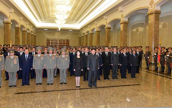 这张朝中社12月17日提供的照片显示,朝鲜最高领导人金正恩(前右)和夫人李雪主(前左)及朝鲜党政军领导人到安放金日成、金正日遗体的锦绣山太阳宫拜谒。新华社/朝中社
