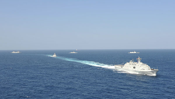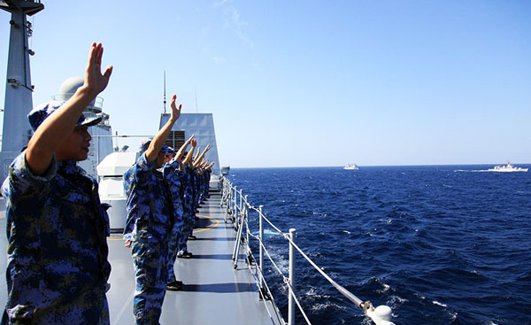 12月22日,在亚丁湾海域,中国海军第十五批、十六批护航编队分航。新华社发(陈耕摄)