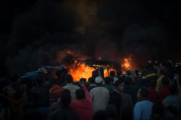 12月24日,在埃及曼苏拉市,当地民众在反穆兄会示威游行中当街点燃一辆据称是支持穆兄会媒体的车辆。新华社记者 潘超越 摄