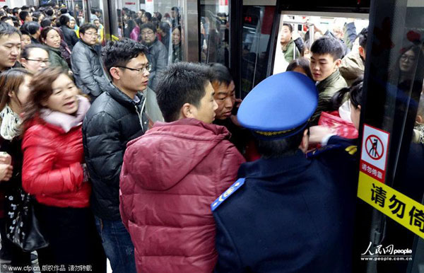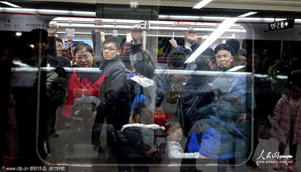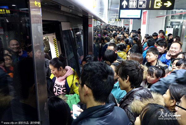 2014年01月01日,河南省郑州市,于近期开通运营的地铁1号线迎来第一个公众假日,当日客流爆棚,二七广场站人头攒动,持续出现站台乘客无法挤上车的状况。体验地铁客流、假日出行客流共同影响导致当天的拥挤状况。沙浪/CFP