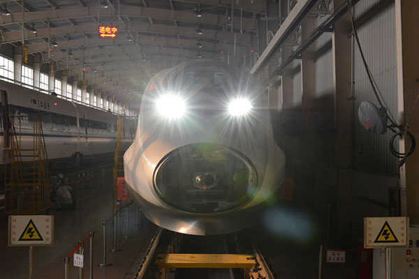 1月3日,CRH380A高速动车组列车完成总组装后进行静态通电测试。新华社记者 吴凯翔 摄