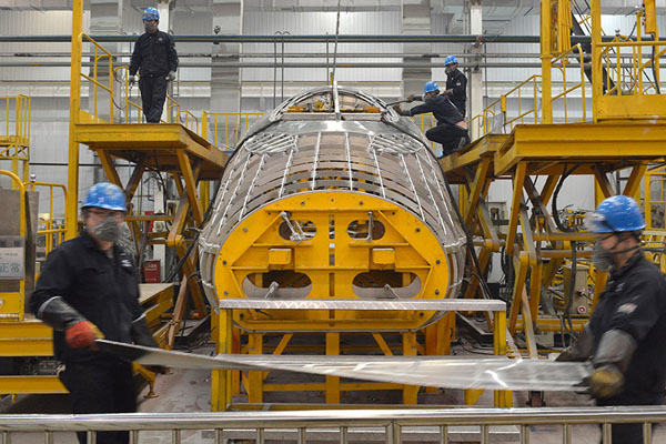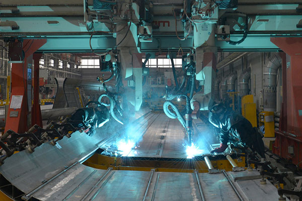 1月3日,工人在中国南车四方股份公司车体制造车间制造CRH380A高速动车组车头的车体骨架。新华社记者 吴凯翔 摄