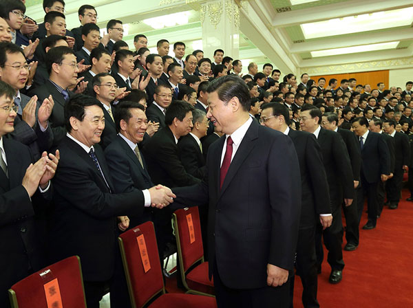 人民大会堂北大厅里,洋溢着热烈的气氛。上午10时许,习近平等中央领导同志来到参研参试人员代表中间,全场响起热烈的掌声。习近平等同代表们热情握手,同探月工程总指挥、总设计师等同志亲切交谈,询问他们工作和身体情况,并同大家合影留念。
