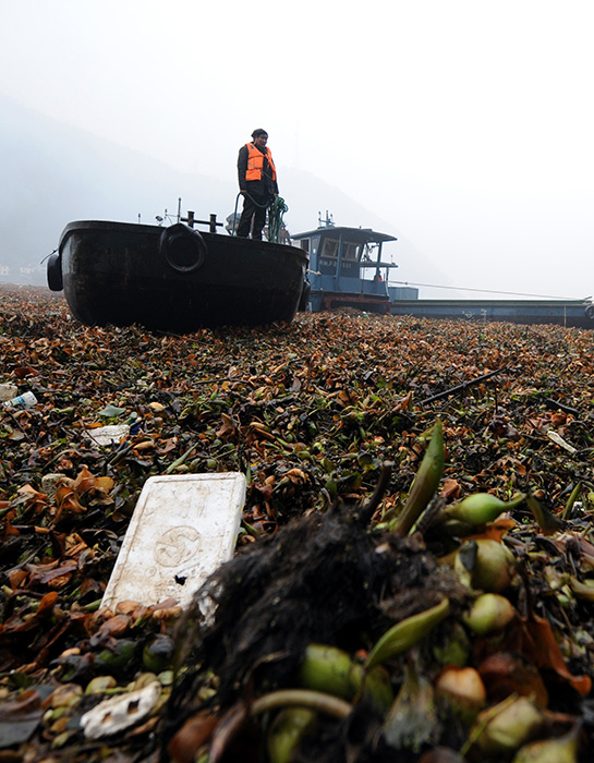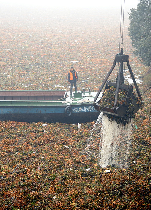 据现场负责打捞水葫芦的杭州市桐庐县相关人员介绍,目前他们每天要打捞20多车、约60吨左右的水葫芦,但由于上游飘来的水葫芦不断,富春江大坝附近的“水葫芦带”还在向上游蔓延。