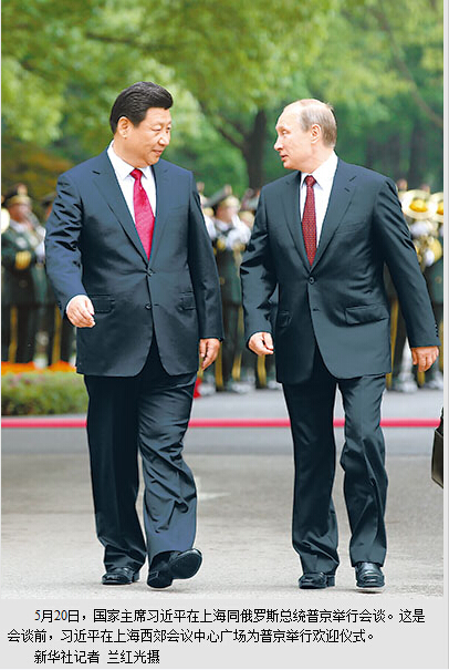 普京表示,俄中关系进入全面快速发展的新阶段。两国政府间合作机制有效运转,立法机构、军队、地方交往频繁,双边经贸和双向投资增势良好,其他各领域交流合作富有成果。我感谢习近平主席亲自关心和推动俄中关系发展,愿同习近平主席继续保持密切沟通和交往。俄方愿积极推进双方油气、核能、电力、高铁、宽体客机、金融等合作项目,愿增加对华油气出口。我高兴地得知,双方就东线天然气项目价格谈判取得重要进展,愿本着互利互惠原则同中方尽早达成最终协议。俄方支持建设丝绸之路经济带,促进交通基础设施互联互通,欢迎中方参与俄罗斯远东地区开发。两军合作很重要,应该继续加强。双方要扩大人文交流,办好今明两年俄中青年友好交流年。俄中在国际舞台上密切协作,是维护世界和平稳定的重要因素。俄方愿同中方加强在联合国、上海合作组织等框架内的协调和配合。