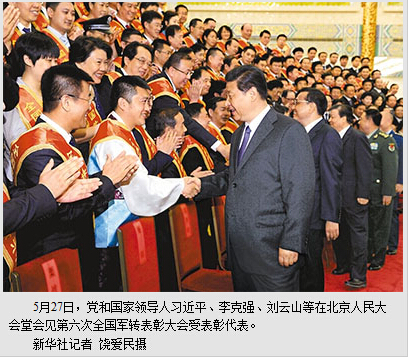 刘云山出席表彰大会并讲话。他说,做好新形势下的军转安置工作,要认真学习贯彻习近平总书记重要讲话精神,大力弘扬军转安置工作光荣传统和军转干部优秀品质,始终坚持为经济社会发展服务、为国防和军队现代化建设服务的基本方针,牢固树立大局观念,努力实现军转安置工作的更大发展进步。要深入把握军转安置工作的方针原则,认真落实政策,坚持以人为本,设身处地为军转干部着想,为他们排忧解难。要深入贯彻党的十八届三中全会精神,以中央关于全面深化改革的总体要求为统领,以建立和实施军官职业化制度为牵引,以形成一整套完善的退役军官安置政策制度为目标,以解决军转安置工作突出矛盾问题为导向,积极推进中国特色退役军官安置制度的改革创新,促进军转安置工作可持续发展。要强化组织领导、强化协同配合、强化工作落实,动员各方面力量共同做好军转安置工作,形成党委领导、政府主管、军队参与、社会支持的良好工作局面。刘云山说,军转干部是党和国家的宝贵财富,是建设中国特色社会主义的重要力量,希望广大军转干部继续保持和发扬人民军队优良传统和作风,坚定正确的理想信念,树立崇高的人生追求,到国家最需要的地方建功立业,为国家富强、民族振兴、人民幸福贡献力量。