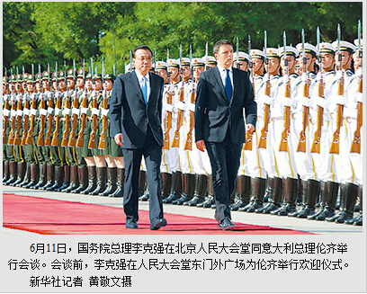 本报北京6月11日电 (记者赵明昊)国务院总理李克强11日下午在人民大会堂同意大利总理伦齐举行会谈。