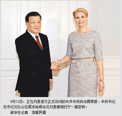 新华社哥本哈根6月12日电 (记者尚军、杨敬忠)应丹麦政府邀请,中共中央政治局常委、中央书记处书记刘云山10日至12日对丹麦进行了正式访问,在哥本哈根分别会见了丹麦首相托宁—施密特,议长吕克托夫特,公主贝内迪克特,经济内政大臣韦斯塔格。