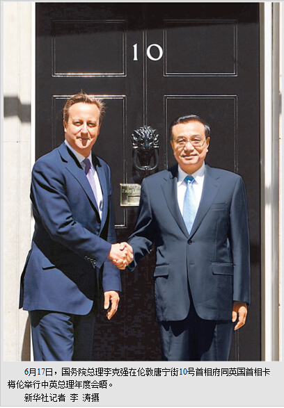 本报伦敦6月17日电 (记者吴乐珺、黄培昭、白阳)国务院总理李克强当地时间17日下午在伦敦唐宁街10号首相府同英国首相卡梅伦举行中英总理年度会晤。双方一致同意以中英建立全面战略伙伴关系10周年为契机,推动中英两国关系再上新台阶。