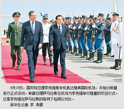 萨马拉斯总理和夫人到机场迎接李克强总理和夫人,并举行了隆重的欢迎仪式。军乐队高奏中希两国国歌。李克强在萨马拉斯的陪同下检阅了仪仗队。
