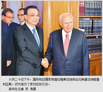 帕普利亚斯热烈欢迎李克强访问希腊,并请转达对习近平主席的亲切问候。帕普利亚斯说,当前希腊同中国的关系在高水平上发展。李克强总理访希取得丰硕成果,体现了新时期两国致力于深化双边关系、促进务实合作的良好意愿。希腊作为中国的好朋友,将坚定奉行一个中国政策,愿同中方深化各领域合作,共同建设好比雷埃夫斯港,更好发挥其在地中海的物流中心作用,提升两国合作水平。希腊赞赏中国在处理地区问题上所持建设性态度。希方愿继续为促进欧盟同中国关系发展发挥积极作用。