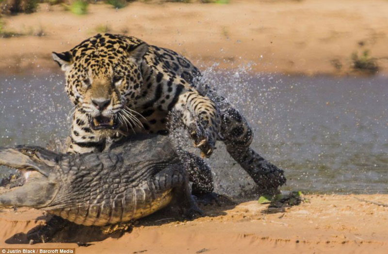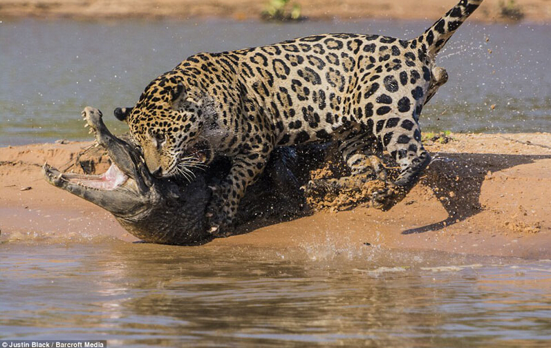 人民网芝加哥7月2日电 美国摄影师 Justin Black在巴西拍到美洲虎涉水猎杀鳄鱼的精彩场面。事发当天,一条约120多斤重的鳄鱼在沙丘上晒太阳,丝毫没注意到一头美洲虎悄无声息地游过河爬上了自己所在沙丘。