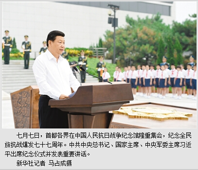 习近平在仪式上发表了重要讲话。他表示,今天,我们在这里隆重举行纪念全民族抗战爆发七十七周年仪式,目的是铭记历史、缅怀先烈、珍视和平、警示未来,坚定不移走和平发展道路,坚定不移维护世界和平。
