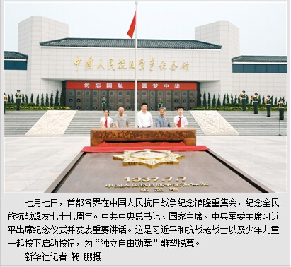 习近平强调,我们在这里为独立自由勋章雕塑揭幕,就是要缅怀在争取民族独立和自由过程中英勇献身的烈士们,就是要缅怀为追求和平正义作出重要贡献的人们,告慰在那场战争中不幸遇难的同胞们。我们永远缅怀他们、铭记他们。