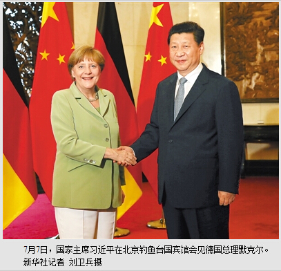 本报北京7月7日电 (记者李伟红)国家主席习近平7日在钓鱼台国宾馆会见德国总理默克尔。双方积极评价中德关系发展,表示要进一步拓展和深化两国务实合作,不断提升中德关系战略内涵。