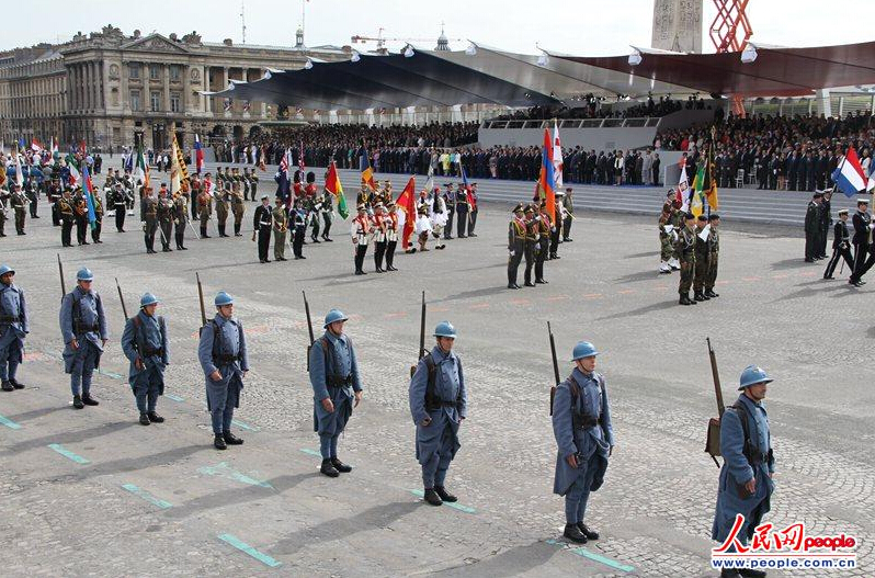 多国军队代表参加此次阅兵暨纪念一战百年仪式。前外交部长李肇星作为中国政府代表出席了活动。人民网记者李永群摄