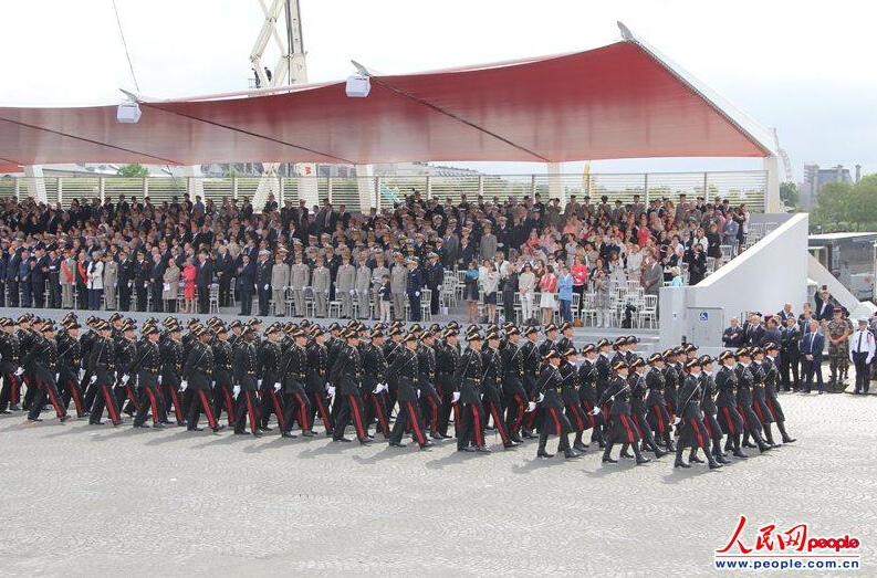 巴黎综合理工学院的学生身着军装经过检阅台。人民网记者李永...
