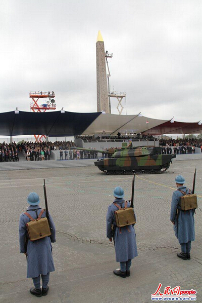 在身着一战服装的士兵的注视下,现代化军事装备从76国政要代...