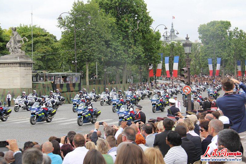摩托车队从香榭丽舍大街驶来。人民网记者邢雪摄