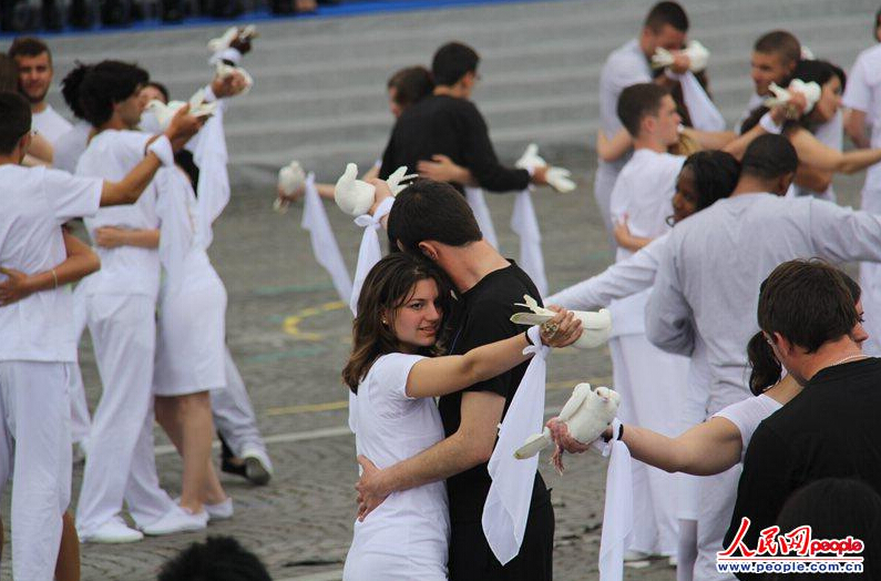 分列式全部行进结束后,约有250名男女青年手捧和平鸽跑进协和广场,在检阅台前翩翩起舞,最后放飞和平鸽表达对未来和平的期望。